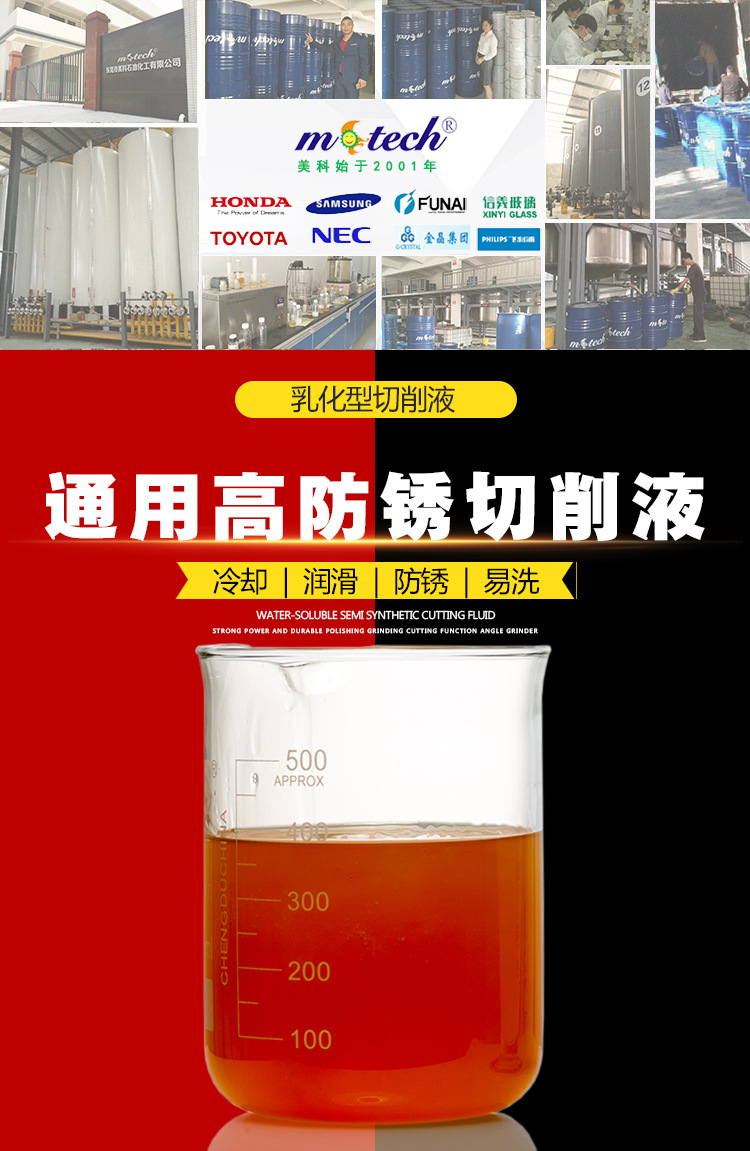 東莞美科通用防銹型乳化切削液,具有優秀的潤滑性能,防銹性能和冷卻性能。廢屑沉淀快,含有特效防氧化成份,可有效杜絕銅合金和鋁合金工件在加工后出現白斑或發黑等氧化變色現象,適用于有色金屬、鋼鐵、鋁合金、銅合金、不銹鋼、合金鋼、鑄鐵、高碳鋼等材料的切削、磨削、鉆孔、沖壓等金屬加工方式。【美科切削液全國招商火熱進行中,誠邀您的加盟!全國免費咨詢熱線400-8898-938】